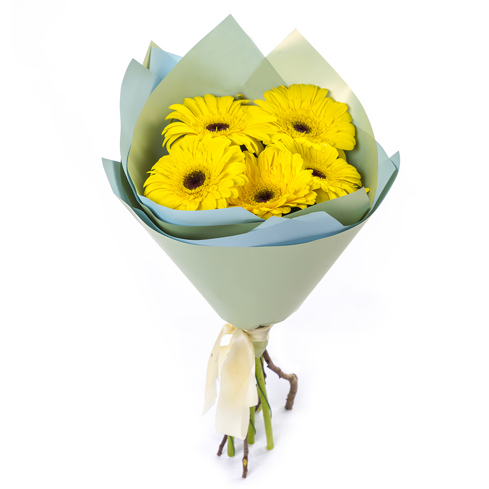 Яркий букет из 5 жёлтых гербер – как кусочек солнца в ваших руках